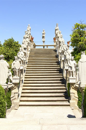 Por entre os canteiros de buxo erguem-se simbólicas estátuas de granito, em que se destacam os Novíssimos do Homem, Quatro Virtudes Cardeais, as Três Virtudes Teologais, os Signos do Zodíaco, as Partes do Mundo, as Quatro Estações do Ano, o Fogo e a Caça. Dispostos à maneira de escadório, encontram-se representados os Apóstolos e os Reis de Portugal até D. José I.